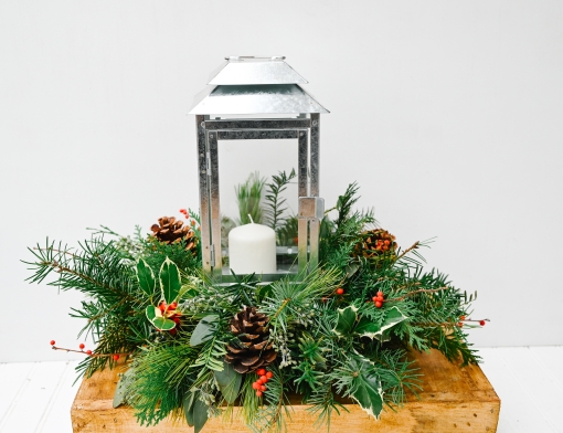 Bring the beauty and scent of the season indoors with this classic holiday arrangement. A charming lantern sits at the center, surrounded by a lush mix of fresh evergreens, vibrant berries, holly, and rustic pinecones. Timeless and fragrant, it’s the perfect centerpiece to warm your home and celebrate the holidays.