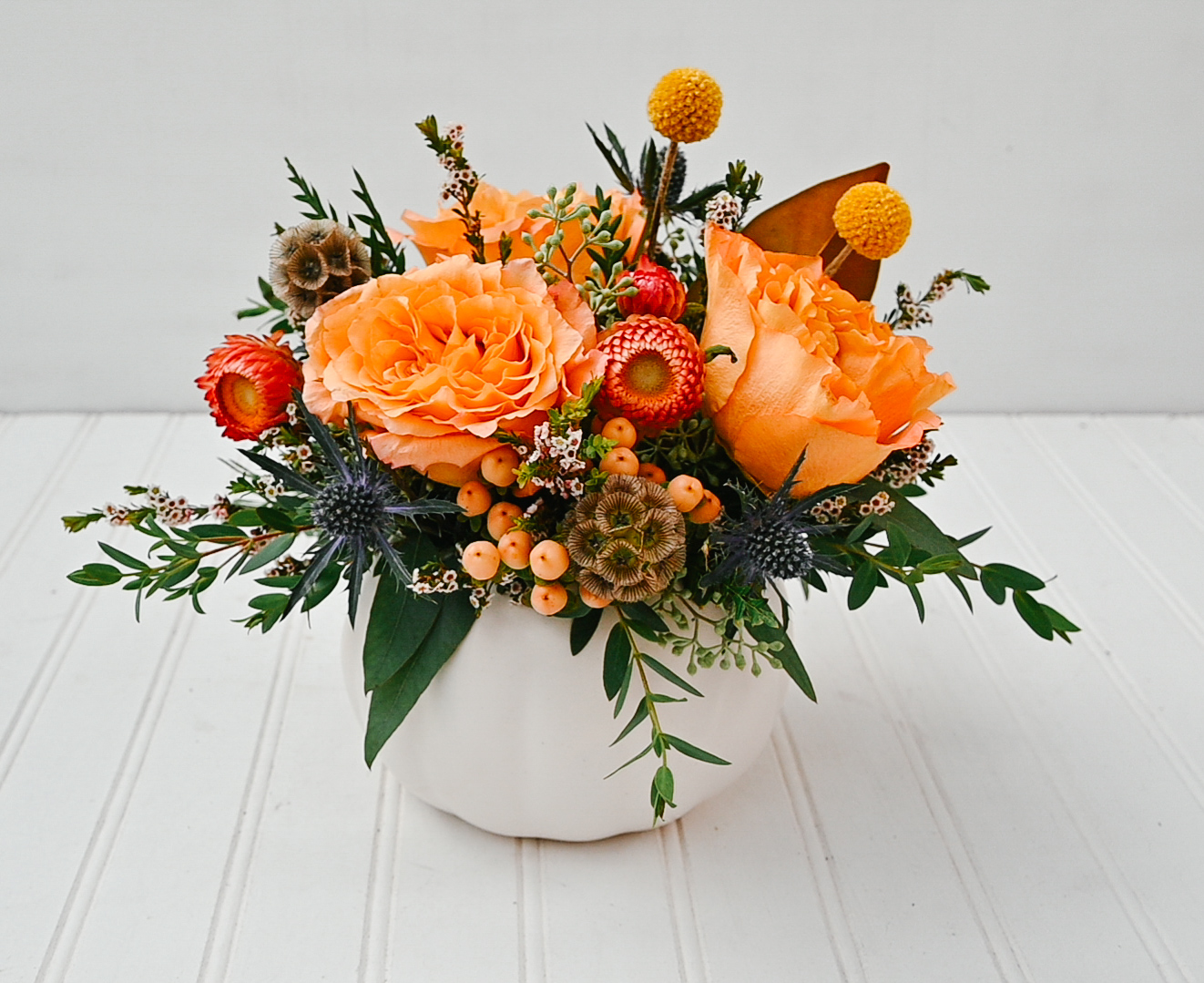 A ceramic pumpkin filled with fall roses, magnolia, strawflower, and seasonal accents.