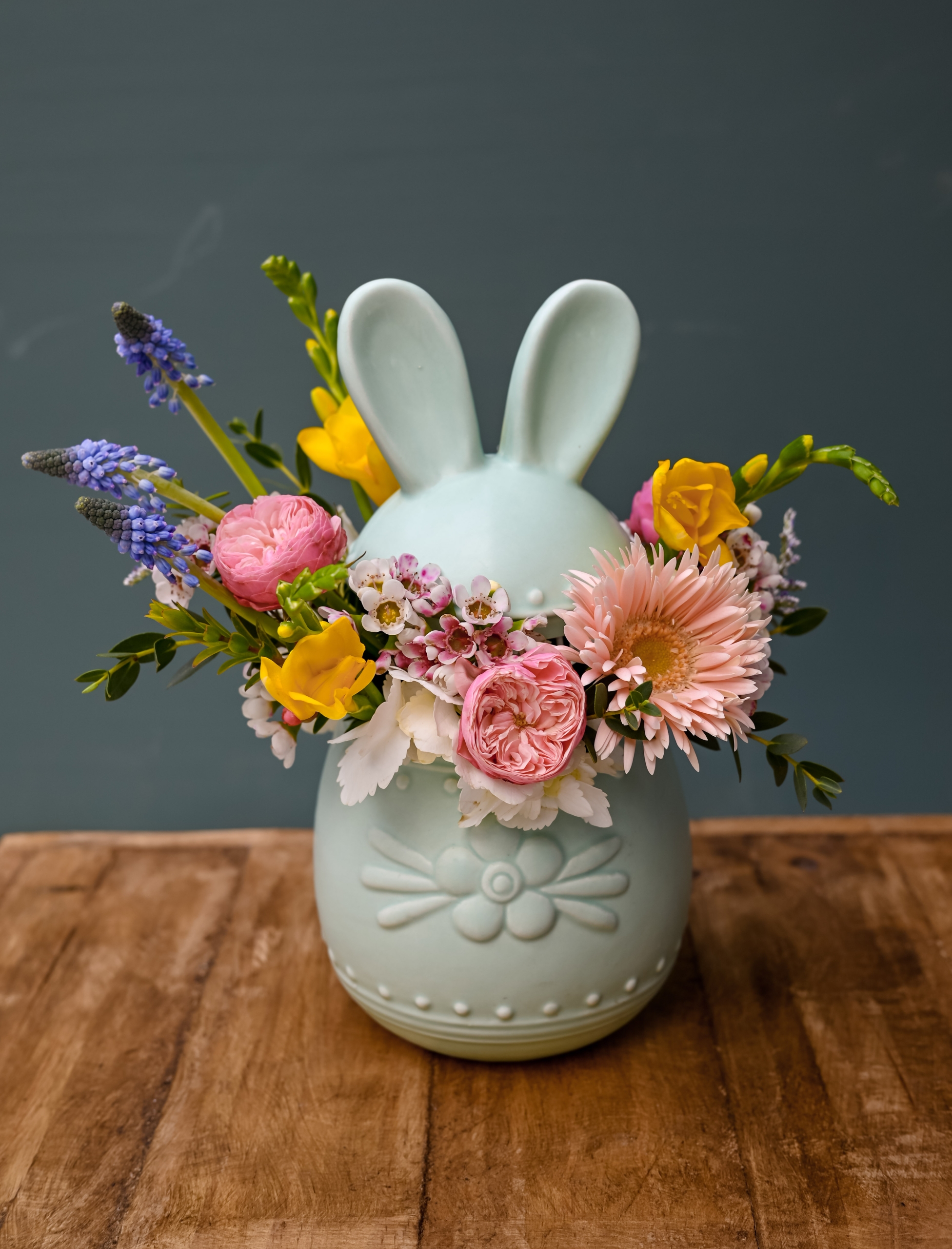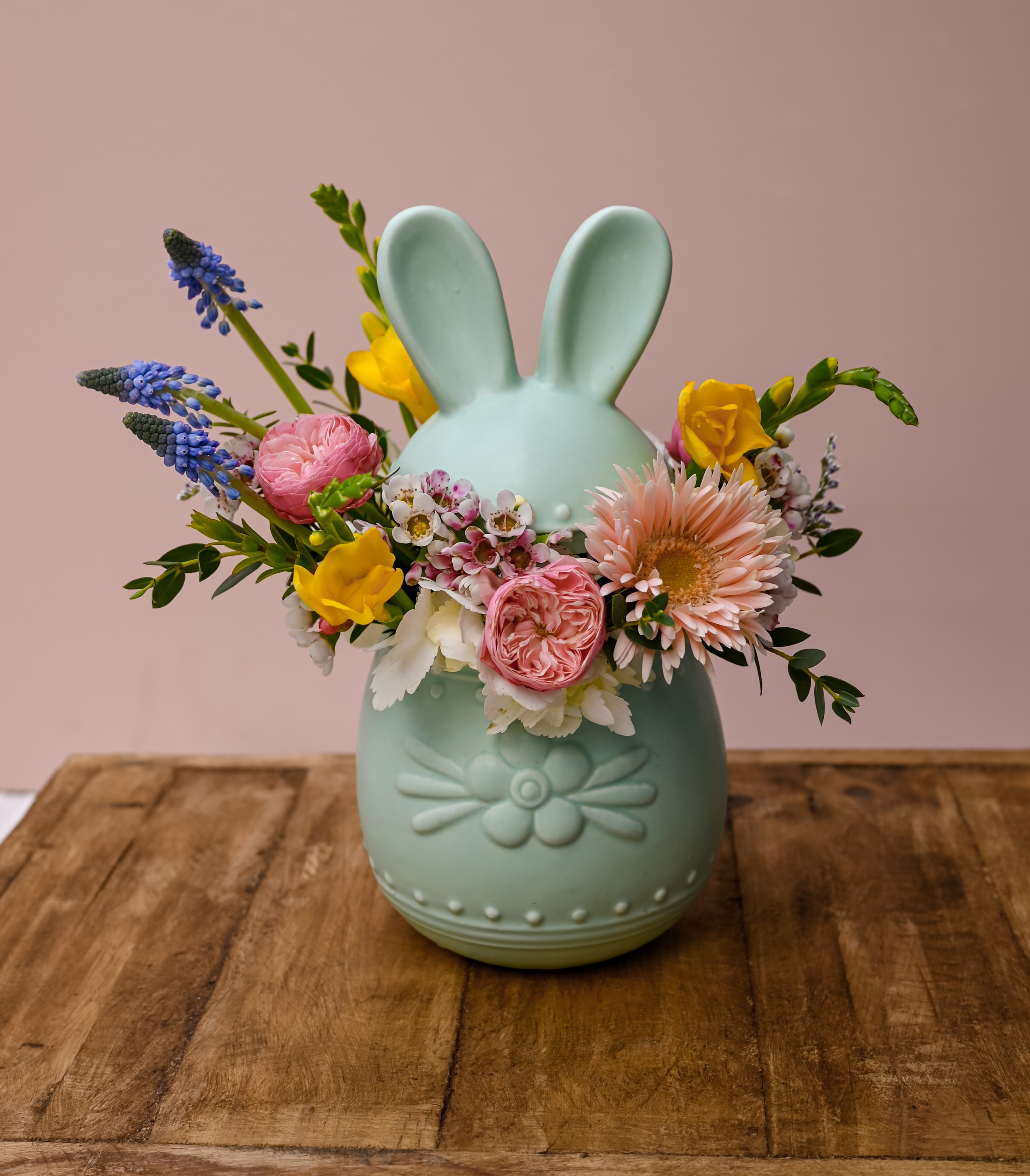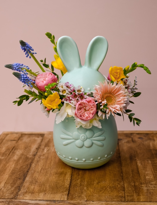 A charming Easter jar arrangement filled with fresh spring blooms in soft pastel tones.