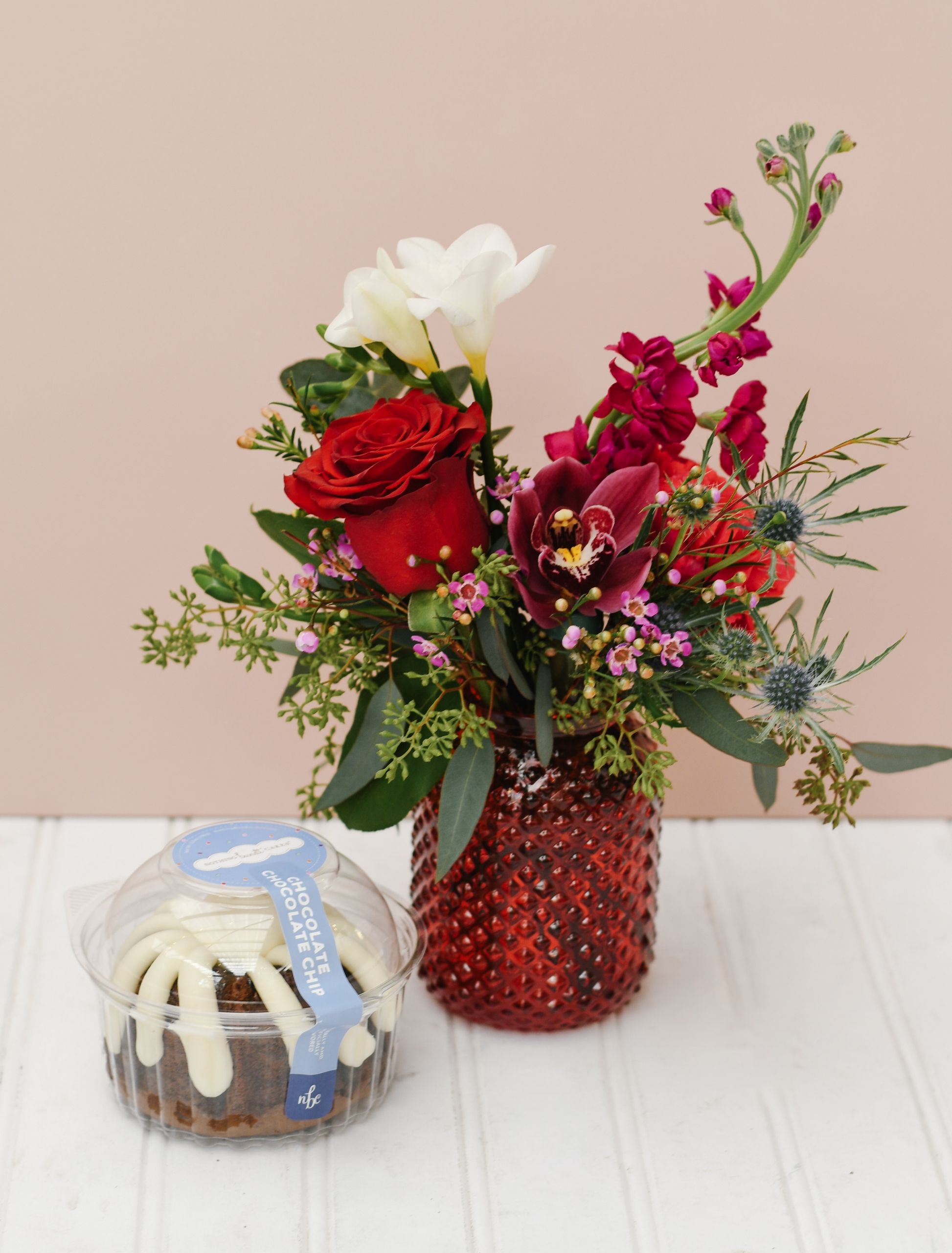 Choose between a vibrant or pastel flower arrangement, each paired with her choice of a chocolate or sweet strawberries and cream bundtlet from, Nothing Bundt Cake. A perfect pairing to brighten her day and show your love!