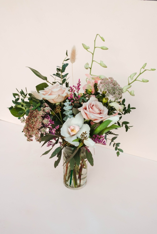 The sweetest assortment of pink and white blooms. Including orchids and roses.